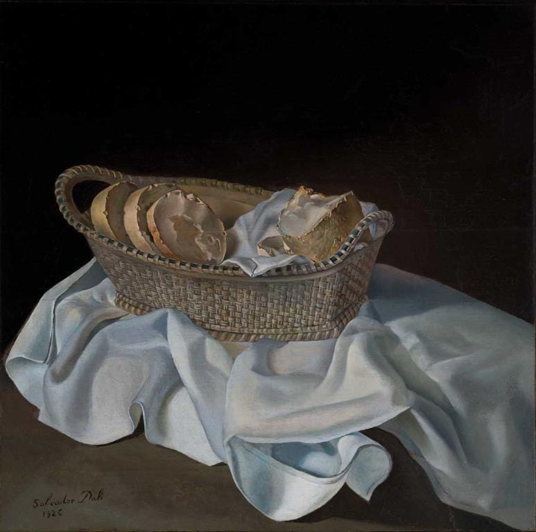 In the end, I kept returning to the paintings from Dalí’s youth, which made up for their literalness with such palpable earnestness: his 14-year-old self’s Impressionist landscapes of the Mediterranean, a portrait of his aunt painted when the artist was 19 (you can see how he was already working out the basics of glassware, which are then on full display in the 1956 piece, “Nature Morte Vivante.”). I loved his bread still life the most (from age 22), which apparently Dalí painted as a kind of Vermeer-mode F.U. to his art school teachers. Again and again, I gravitated toward the painting to examine the pearly white folds of the tablecloth, the exact crosshatches of the basket, the snowy white inside of the bread that suggested either a sacred glow and/or a lack of familiarity with rendering crumb texture. The true passive experience of the entire afternoon, actually, required one to simply stand and look.