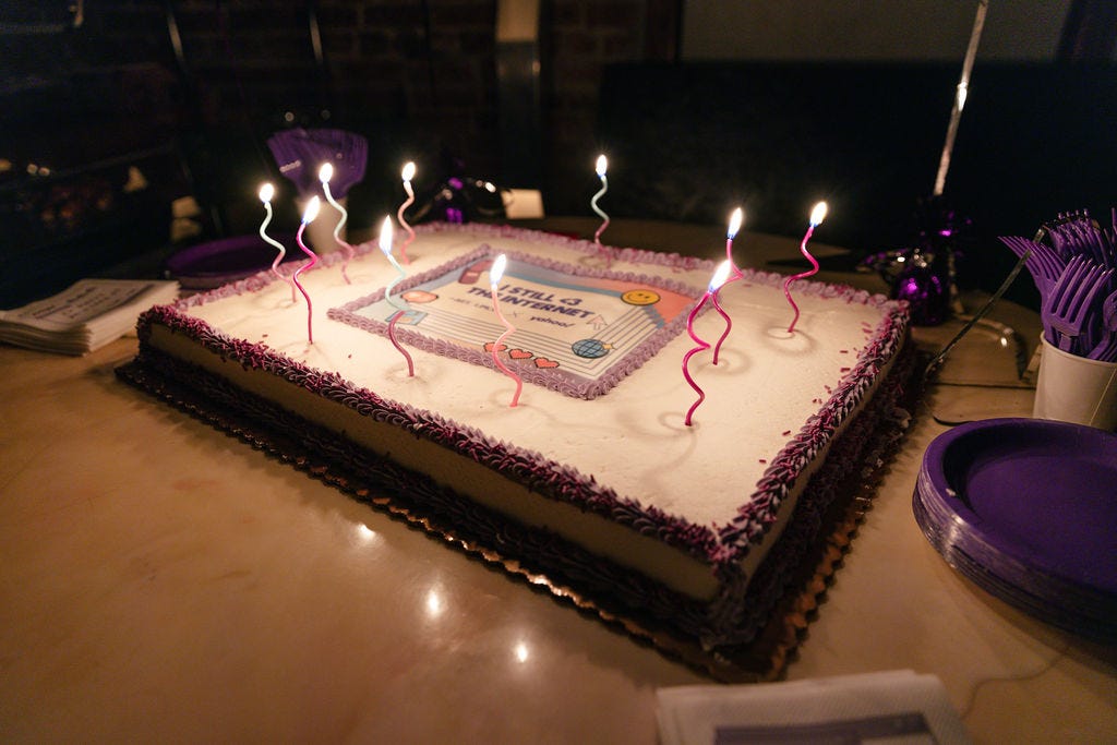 Last Thursday, we threw a party with Yahoo called “I Still <3 The Internet” to celebrate the 10th “birthday” of Deez Links. It was everything I ever wanted a media party to be: free-flowing sparkling cosmos (thank you Nightmoves!); purple lychee martini-flavored Solid Wiggles shots; piles of Chrissy’s Pizza; a giant Wegmans sheet cake, snowy and immaculate as a new iPhone screen; and about a millionish mutuals making merry.