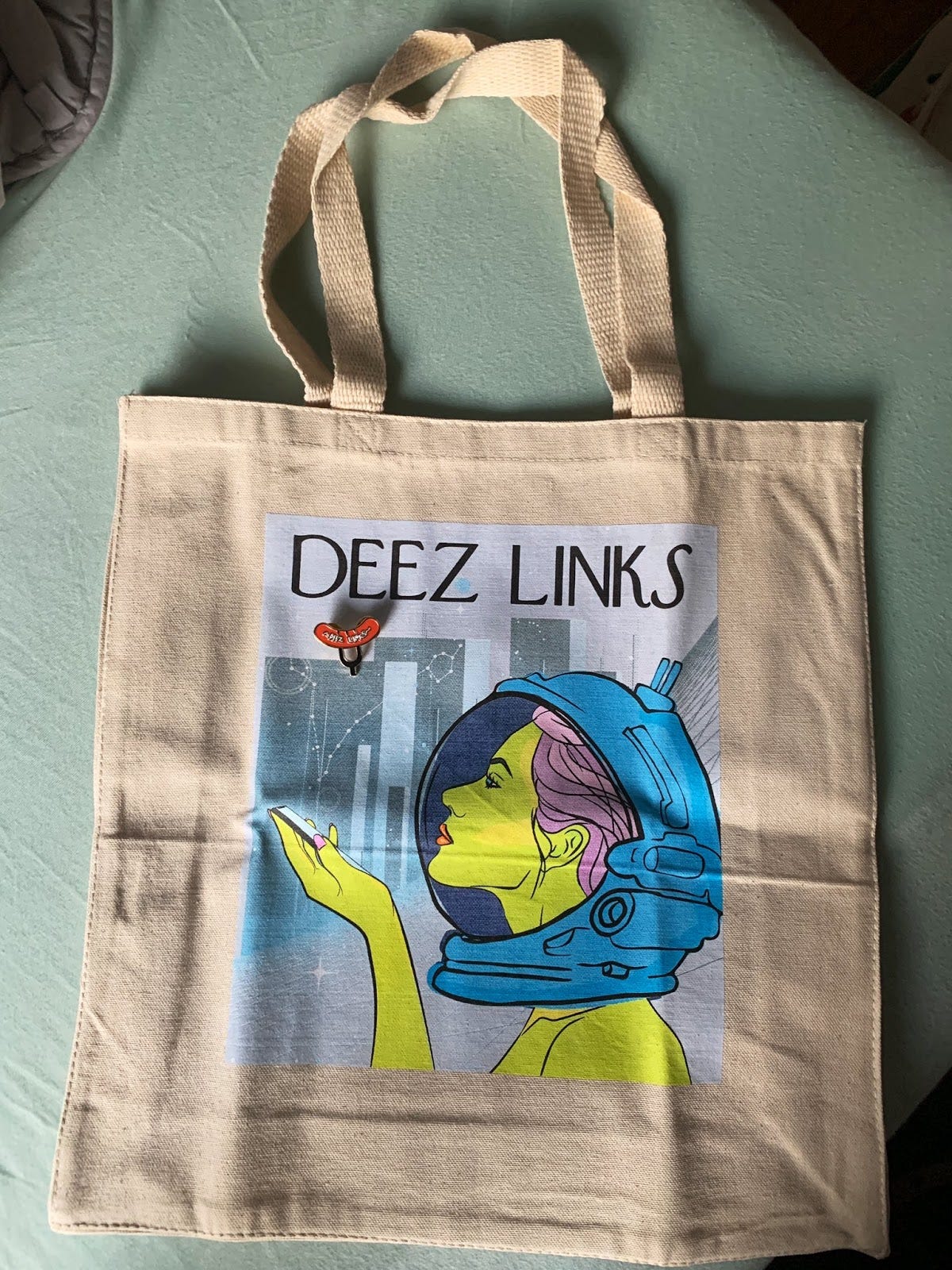 hi, hello, sorry, I know we agreed to not see each other on weekends BUT I did want to let you guys know that **today is the last day** to use the code DL15 to get 15% off totes and pins in the Deez Links merch shop!