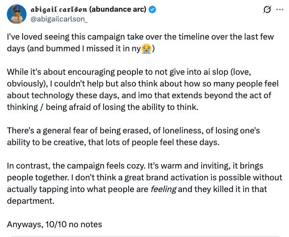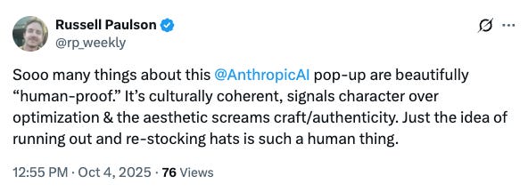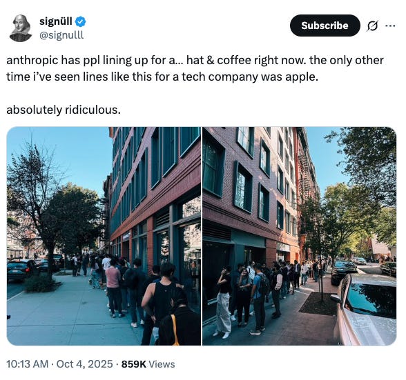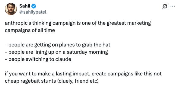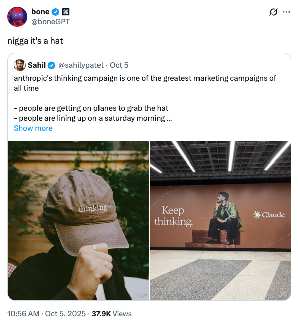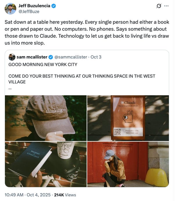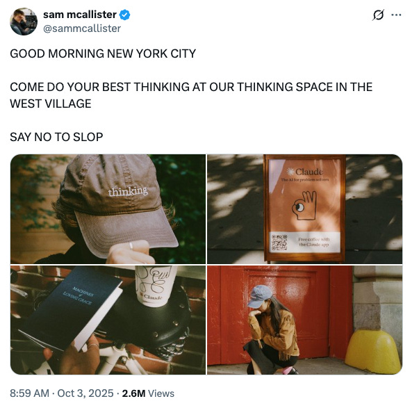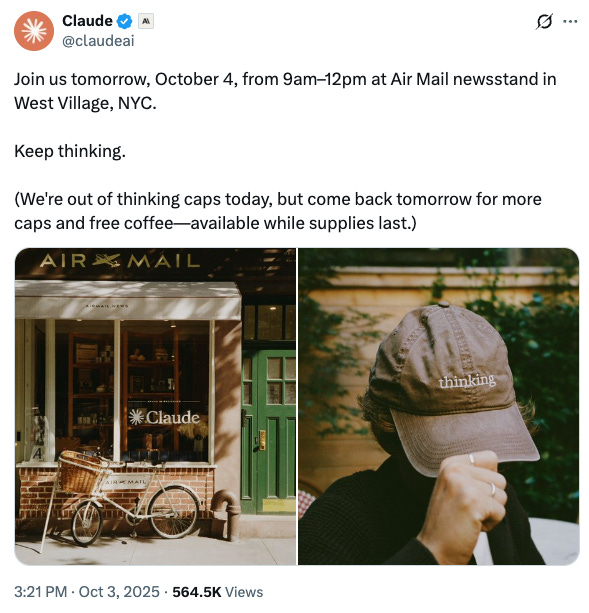 Over the weekend, Twitter/X was inundated with posts about the Claude/Anthropic pop-up at the Air Mail shop in West Village, which basically amounted to a lot of orgasmic swooning over Anthropic’s “anti-slop”“aesthetics” (which many fans compared to being on par with Apple) and the absolute F-tier visual pun of handing out baseball caps with the word “thinking” embroidered on them. But you would have thought Steve Jobs himself reincarnated and was doing a meet-and-greet judging by the buzz, which even by 2025 standards wherein marketing is the only art form we are incentivized to develop opinions on, rose to Jesus-lives!! levels of adulation.