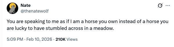 One more thing: I do think Joe’s story on Clavicular is worth reading, if only for this excerpt, which underscores more than anything about how secondary the matter of actually having actual sex is to this demographic, versus the knowledge of being desired:
