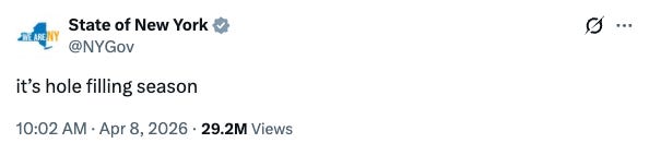 Whether it’s Gen Z or due to Zohran, there’s certainly a Z-fication of institutional comms in New York. Exhibit A: that tweet about hole-filling.